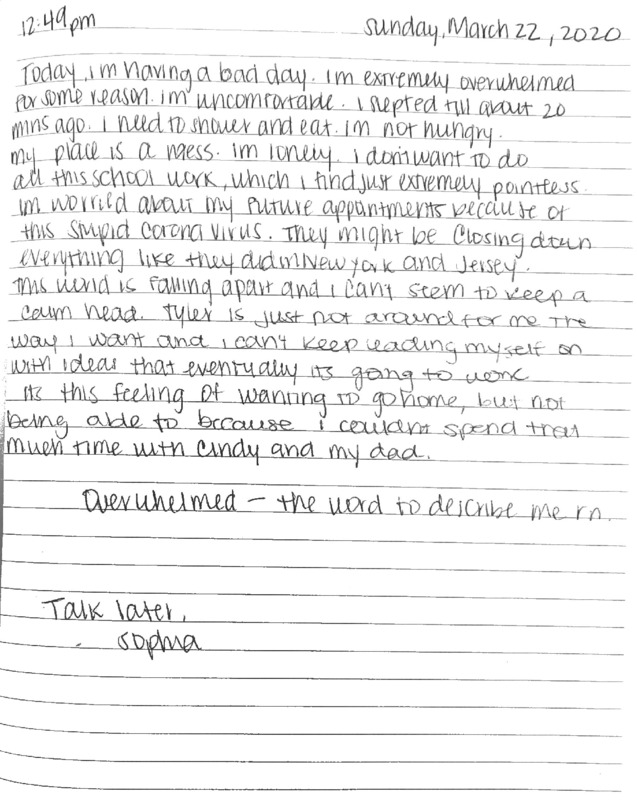 When I wrote this journal entry the world was just starting to go into a panic. Mass hysteria caused every town to be placed on lockdown. Everyone was being forced to quarantine and had a curfew at 9 pm everyday. There was no explanation of what the Coronavirus was other than it was fast spreading and killing thousands of people. In March, there was still a lot of uncertainties. As a college student everything was very abrupt. Our classes and school were shut down fast following students traveling and coming back and testing positive. With being locked into a dorm where roommates left, the dorm life got very tough. Feelings of anxiety, depression, and loneliness were common to feel during this time. You go from having an active social life to being terrified to be near someone. It takes a toll on your mental health. Additionally, in this journal entry I talk about a relationship with a guy that wasn't going to work, another active conversation about how the want to see someone amidst the pandemic was not attractive and easy. There was a want to go home, but my family lived in Miami and their cases were higher than the one's on the West Coast of Florida. This entry was important to me because I thought it was a perfect description of the chaos and emotional uncertainty of the beginning of the pandemic.