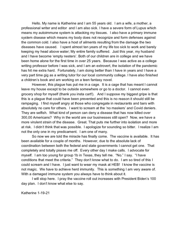 My name is Cassidy, I have lived in northern Utah for the last six years. I’m originally from Mesa Arizona. I am twenty- three years old. I currently work at a hospital in northern Utah. I’m a certified nursing assistant. I have worked on the Covid-19 unit and helped many patients who have had Covid in the beginning of the pandemic. I currently live with my parents. My parents are considered high risk. My dad is 76 with COPD, emphysema and cancer. My mom is 65 with an auto immune disorder. At first I didn’t want the vaccine, I was super weary of it since it was manufactured so quickly. I honestly thought it was just over hyped. But working with the Covid -19 patients I realized it affected everyone differently. Even though I personally wasn’t worried if I got Covid-19 . I was worried about catching it and giving it to someone who couldn’t fight it off, especially a loved one. And then I realized everyone has a loved one. And that’s when I decided to get the vaccine. On December 22, 2020 i received my first dose of the moderna Covid 19 vaccine at the hospital I work at, Ogden regional medical center. At first I didn’t even feel the shot. After I received the vaccine I had to wait 15 minutes to make sure I would have no side effects. I was fine then I left the hospital and headed to school and did my certification for my class. The next morning I woke up and my left arm was super sore and I had a really hard time moving it, since it was so stiff and painful. I experienced some chills but other than that I was fine. And today January 18th 2021, I went back to the hospital I work for and I received my 2nd dose of moderna Covid -19 vaccination. I felt the shot this time, the serum was a thicker consistency. My arm is tender and I feel a general feeling of malaise. I was told by the nursing supervisor at work to take Tylenol before my vaccine and to take it following the vaccine, and to make sure to get the vaccine on a day where I won’t be working or doing anything the next day. Unfortunately I work and go to school full time. So tomorrow I have school but I’ve been keeping up on taking Tylenol. I received this vaccine not for myself but rather for others, because I would hate if my parents caught it and didn’t make it. And everyone has a family member that could possibly not make it if they caught Covid-19.