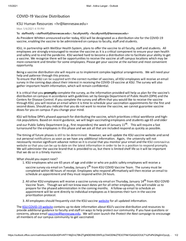 Kennesaw State University notified faculty and staff on January 4, 2021, that the university would serve as a distribution site for the COVID-19 vaccine to students, faculty, and staff according to CDC guidelines. All employees and affiliates not slated for the first wave, which includes people over age 65 and designated first responders, will fill out a survey on January 14 to indicate their interest in receiving the vaccine and enable them to be added to the vaccination schedule. Although I am only 36 years old, I am teaching in person this semester, and I am eager to get the vaccine.