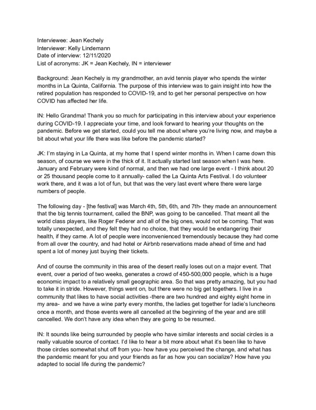 Background: Jean Kechely is my grandmother, an avid tennis player who spends the winter months in La Quinta, California. The purpose of this interview was to gain insight into how the retired population has responded to COVID-19, and to get her personal perspective on how COVID has affected her life.