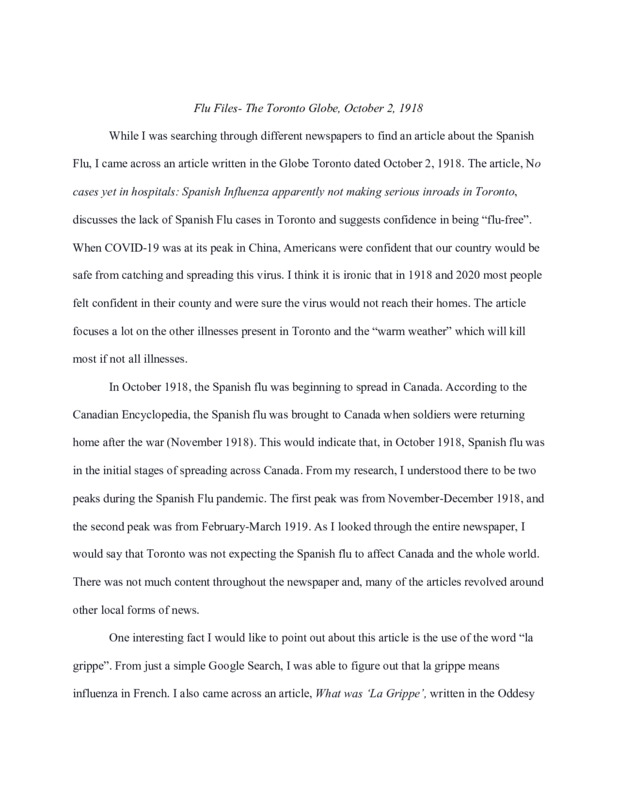 In this short paper, I wrote about similarities between the 1918 Spanish Flu the 2020 COVID-19 pandemic. I analyze an article written in the Toronto Globe on October 2nd, 1918, and compared it to the events that happened in January-February 2020 in the United States.