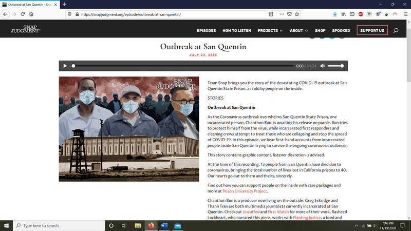 Podcast episode produced by Snap Judgment in which they look at covid-19 outbreaks in San Quentin prison