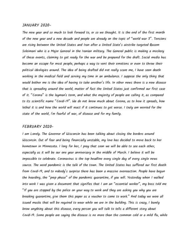 I chose to include this story for this archive to humanize the broader health and historical context of the pandemic. This was both the easiest and hardest thing for me to create for this archive. The easiest because I was able to let the words flow out of my heart and be typed onto a word document; the hardest because I’ve realized just how ripe these feelings and memories still are for me. My emotions and memories of late July and early August have not fully healed. It’s been hard to accept someone’s death without physical closure. There were no last goodbyes, no hugs, no close contact of any kind to seal the wound in our hearts. I’m still longing to physically embrace my family; but for them I’d wait as long as I have to in order to do that safely.