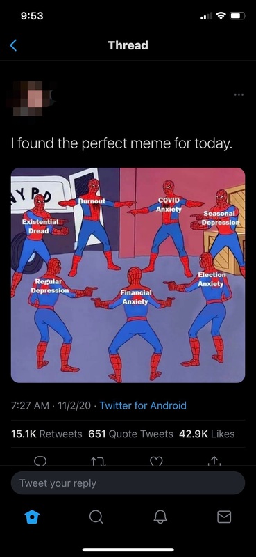 My last image, is a meme that a friend of mine sent me. Similarly it is a an Instagram page called 'Covid 19 Funny Memes.' Though very funny, it also highlights a lot of the communal attitudes that have fluctuated and changed through out the pandemic. In late February/ early March, I believe that because it the pandemic was largely still a distant story that was affecting Europe more readily and Australia, it was something we really engaged in a kind of hysteria with. Because we hadn't experienced it, it was something we couldn't truly understand. Certainly these sought of humorous memes were not being created back then. But now I feel having lived with the pandemic for the last 8-9 months, people's attitudes have altered so much. I think because we are now more prepared to satirise, mock or create humorous memes is not to suggest that we have become apathetic towards the pandemic, but I think it shows that we are 'over it.' I think now living with this shadow over our lives for 8 months has taken its toll, and humour may be one way we can attempt to disassociate ourselves from this monotonous cycle.