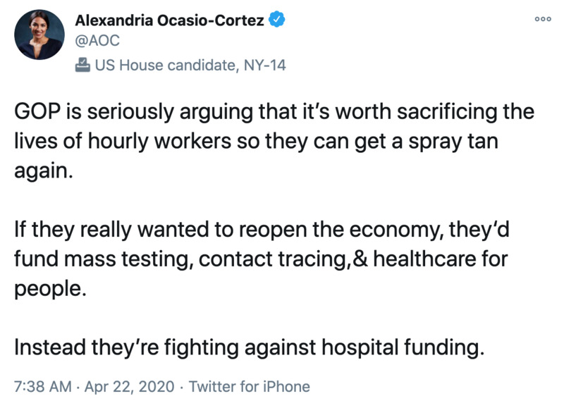 This tweet is by Alexandria Ocasio-Cortez and reads: “GOP is seriously arguing that it’s worth sacrificing the lives of hourly workers so they can get a spray tan again. If they really wanted to reopen the economy, they’d fund mass testing, contact tracing, & healthcare for people. Instead they’re fighting against hospital funding.” This tweet briefly brings up the not-scientifically-founded idea of “re-opening” in order to boost the economy. And the lack of funding for mass covid testing/tracing, and general healthcare is also mentioned.