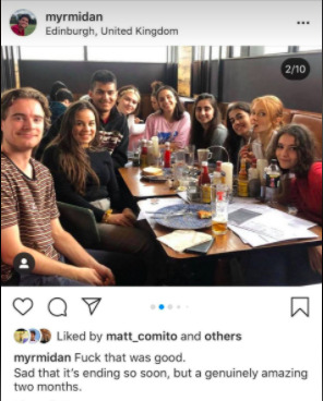 I was on exchange in Edinburgh in the first half of 2020, and was forced to return home to Melbourne 3 months early. This was an incredibly sad and confusing time, where so many of my plans and dreams for the rest of exchange were scuppered. Things moved at a breakneck pace. My first exchange friend decided to leave Edinburgh on the 12th March, and by the 18th March I was flying home to Melbourne, having made dozens of rushed goodbyes in the previous few days. This object is a farewell post I made on Instagram, with 10 photos with my friends in Edinburgh. It sums up the mixed emotions I felt in those days - sadness, fondness, nostalgia, gratitude.