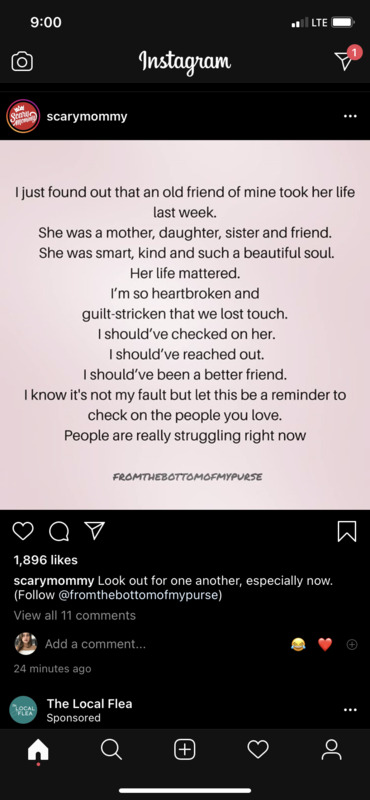 This post is not my own but it did make me reflect. Social distancing and quarantine are affecting people in a variety of ways. Mostly increasing depression and anxiety. Last week, my cousins twelve year old daughter killed her self. On the outside her life seemed normal, some would even say she lived a privileged life. Internally though, it’s clear that she was suffering. She was silently carrying a heavy burden which because unbearable when she was no longer able to leave the four walls of her home. I can only imagine how many stories there are just like hers. COVID is killing people physically and emotionally.