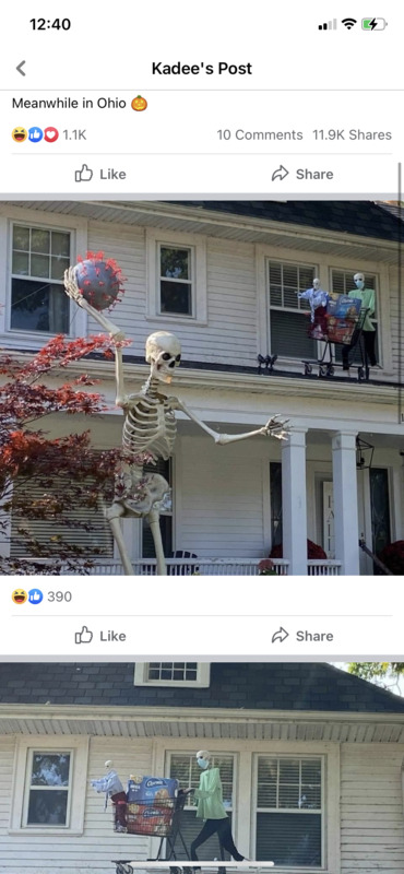 Scrolling through Facebook I came across this on my feed. A home in Ohio has been decorated for Halloween COVID style. I thought this was a hilarious way to showcase how COVID has affected every aspect of our lives. I love seeing the humor during this time when we need it most. It looks like the biggest and scariest skeleton is playing dodgeball with COVID balls. I’m not sure which skeleton I loved most, the one with the Lysol or the one with the toilet paper.