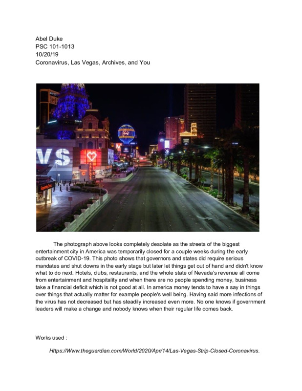 I remember the first day the strip closed I ran into a guy at the gas statio who had to clear out the treasure island casino. He told me it was a very eerie feeling. This was March 17th or 18th I believe. This is importtant to me becuase of what it represents. For example, Nevada had an unemployemnt rate of nearly 25% due to the shutdown. This not only hurt 25% of the population, but all of the surrounding businesses as well that rely on the strip to bring in customers.