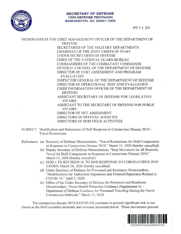 Beginning in mid-March I began working a minimum hour schedule in order to ensure that as few people as possible were in the office. We assumed the pandemic would blow over soon and that like with most other things the Department of Defense was just overreacting and rolling out guidance that would expire quickly. On April 20 it became apparent that this was not the case. The PDF seen here shows that this was not something that was done with a lack of care or critical thinking because stopping all DoD movement is not done lightly or easily. This order also began my additional two more months working from home or in my workplace with a severely cut back schedule. This stop movement also impacted my life by forcing me to stay in Germany for months longer than expected, as well as numerous friends and coworkers who were suddenly left with no way to leave the country after shipping all of their household goods or their vehicles. Essentially it through thousands of people into a state of instability that could only be rectified by the passing of time until the stop movement expired.