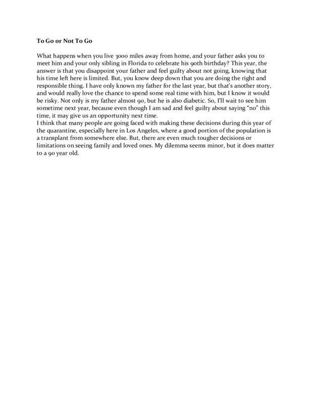 I think that many people are going faced with making these decisions during this year of the quarantine, especially here in Los Angeles, where a good portion of the population is a transplant from somewhere else. But, there are even much tougher decisions or limitations on seeing family and loved ones. My dilemma seems minor, but it does matter to a 90 year old.