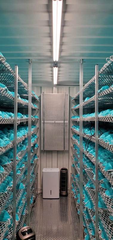The final process used an aerosolized hydrogen peroxide that would be in a converted shipping container that would circulate air and the hydrogen peroxide over and around the masks. After this process was complete we would take the masks out of the container and take them to a "clean room" and sort them once again for masks that had made it through our first screening and then we would package them for future use if necessary. Hopefully those masks will never be used.