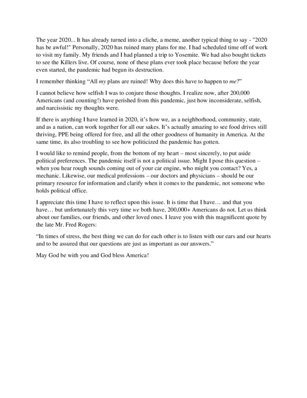 At this point in time everyone, myself included, is starting to feel the fatigue of living in a pandemic for months. It’s easy to think only of ourselves, of the things we’re missing out on. But what if instead we think about what we owe each other? Yes, wearing a mask can be inconvenient, but I owe it to the people I pass by in the grocery store not to intentionally put them at risk for infection. Their lives are equally valuable to mine. When I look at someone as I walk past them I think about what their story might be. Do they have children? Grandchildren? An elderly relative they care for? An underlying medical condition? What hopes and dreams do they have for the future? And shouldn’t I do everything in my power to help keep those things safe? When I think of it in those terms suddenly wearing a mask doesn’t seem all that difficult.
