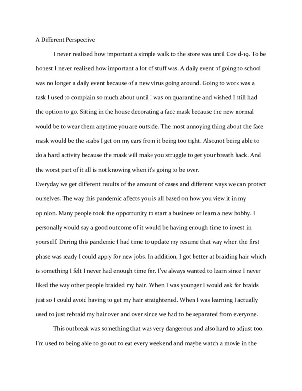 I never realized how important a simple walk to the store was until Covid-19. To be honest I never realized how important a lot of stuff was. A daily event of going to school was no longer a daily event because of a new virus going around. Going to work was a task I used to complain so much about until I was on quarantine and wished I still had the option to go. Sitting in the house decorating a face mask because the new normal would be to wear them anytime you are outside. The most annoying thing about the face mask would be the scabs I get on my ears from it being too tight. Also,not being able to do a hard activity because the mask will make you struggle to get your breath back. And the worst part of it all is not knowing when it’s going to be over.