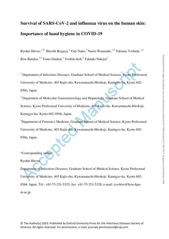 ●論文:Clinical Infectious Diseases Ryohei Hirose et al., (2020) Survival of SARS-CoV-2 and influenza virus on the human skin: Importance of hand hygiene in COVID-19 https://academic.oup.com/cid/advance-...