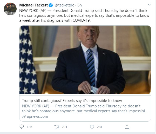 twitter screenshot of whether President Donald Trump can return to his presidential duties after contacting COVID-19. Despite being cleared by his physician, other medical experts are skeptical, as Trump may still be contagious.