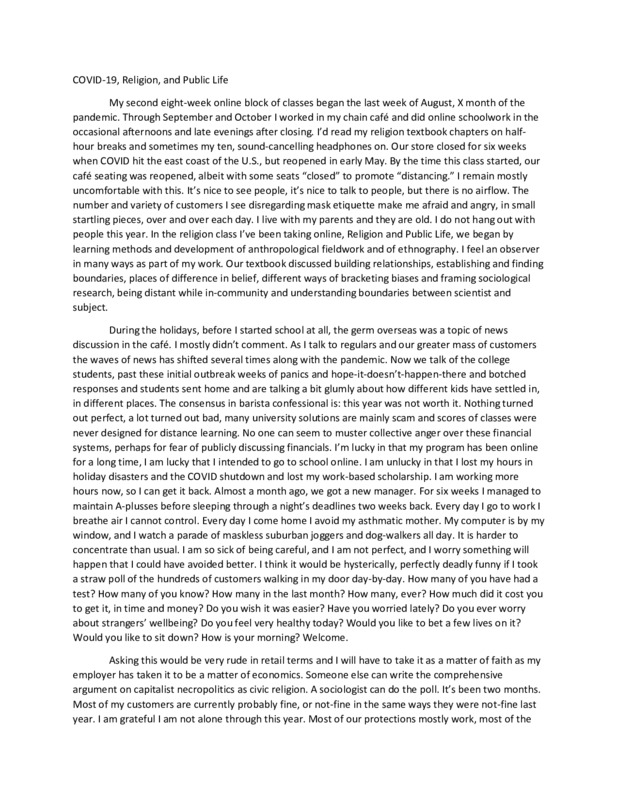 Everyone has gone through wildly different circumstances in the past 6 months, but due to the single same virus. I never thought a virus would be able to shut down the world as we know it within weeks; and in my young life I have taken a valuable lesson from all this: anything can happen at anytime, and to cherish the time you have. With this I don't mean anything in particular, I relate this to people, enjoying going places freely without fear, enjoying being with your family etc... Anything! Different things can happen in an instant, and learning to adapt to them is simply part of life. The time I had alone allowed me to ponder several issues in my life, such as religion; which is why I chose the Religion 101 class this semester. I could not have asked for a non-biased view and will carry lots of the knowledge I learnt into my life. Although I am personally agnostic as of now, I learned through watching others in the pandemic how religion can serve as something very important in providing faith and hope for many, whereas I thought before taking the course religion was a fraud and causes negative outcomes such as war. I have become more understanding on how it can positively benefit entire communities and change individuals lives, and while I continue to be agnostic I completely respect peoples faith's; as it is their personal relationship with their god. At the beginning of the pandemic, I had no idea I would come out on the other side with this perspective, and maybe one day this curiosity will lead me towards a more religious lifestyle, as I feel it gives life a purpose. Without a purpose, a need to do good and inflict positivity in the world, what is life truly for? These are just some of my thoughts at this time thank you Professor Shoemaker!