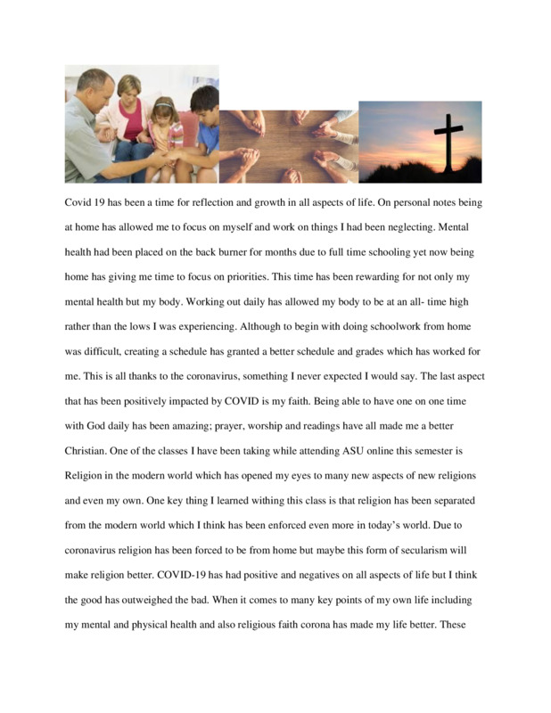 This pandemic has been something out of the ordinary for everyone across the world. Unless of course you have already lived through a different pandemic like this one. This pandemic has resulted in many negative effects. Being locked inside everyday, businesses closing, people dying, and everything having to turn completely remote. Everything is just different now. People have to social distance, wear a mask etc. The negatives people can take from this time can be astronomical. It is time to look at this as a positive. At least for me, yes there have been many negatives through this pandemic but I have also used this as an opportunity to better myself physically, mentally, and spiritually. I have worked out and focused more on school in many ways. I have not been perfect but during this pandemic, I have thought about what I wanted to do and what I want to achieve in my life. I want to put my faith in God and my family first. I also wanted to put my health first in every aspect. Everything else to me would come next with my hard work ethic and my drive to be successful. I am in a good place right now during this pandemic and I know there are many people out there that are not. I want to be able to help people out and be there for the people that I care about. I feel like I have done that for the most part during this time. It is time to focus on what matters most and that is taking care of myself and the people I love and care about the most while honoring God along the way. This REL 101 class helped me adopt a new perspective to how other people see this subject and how it can play a factor in their lives. Personally, my faith is the most important thing I have and I will cherish that forever. Without my faith in my God, I am nothing and nothing I have been blessed with could be possible.