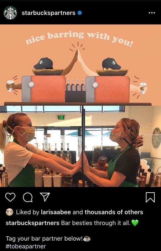 I cannot upload personal pictures from work, but I have been managing a Starbucks through COVID-19. This is an official Starbucks Partners Instagram post of some of our safety plexi-glass guards on our bars to reduce contact between our partners, and our mandatory mask policy. I have spent anywhere between 40-60 hours a week at work this whole time and so I thought it most appropriate to speak on my experience as an essential worker. In the beginning of the pandemic, we were changing rapidly and frequently, with so many conference calls I could barely keep up. I was incredibly new in my role as Store Manager, so when we shut the cafe's down across the company it made it very hard for me to create relationships with my regulars, but I got to know my baristas very quickly. My team has become very close and work together more like a family than anything else. During the lockdown portion of the pandemic, we were the only people we saw outside of our families for about three months. This whole experience has made me seek out new hobbies and really appreciate my time with my friends (when I can see them) because you never know how long it may be until you see them again. At my location, we are training our new staff in order to try to get our cafe back open soon. It has been so long now that it will be very strange for the newer staff to see people inside our building for the first time.
