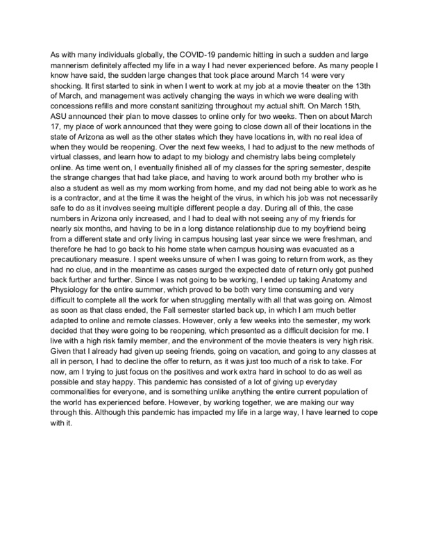 The story I chose to upload was my own short story written in the perspective of third person. I wanted to submit something that would be set apart from the other submissions. We focus so much on the pandemic and how if we don't use a mask or follow rules we could die. We have allowed fear to control our thoughts and emotions, allowing fear over facts to control our actions. I am more afraid of those acting out of fear as opposed to the virus itself. I hope the simplicity of my story brings a different perspective to the table of this topic.