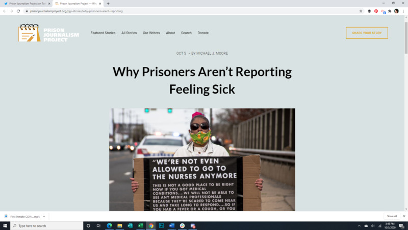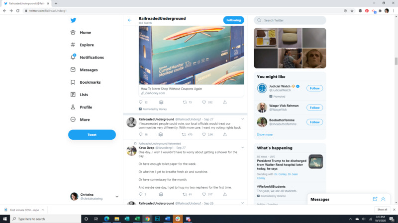 These images show the Tweets of an incarcerated person utilizing a contraband cell phone to let the outside world know about prison conditions during the pandemic. This week he talks about the ability of incarcerated people to vote would cause them to be treated better, living like a caged animal, lockdown, going outside, mental health, watching presidential debates in prison, a second Covid outbreak happening in his prison, how important family connection is, incarcerated people are eligible for a stimulus check, people of color being the majority of incarcerated people and the majority of Covid deaths, difference of sentencing of white and black people,