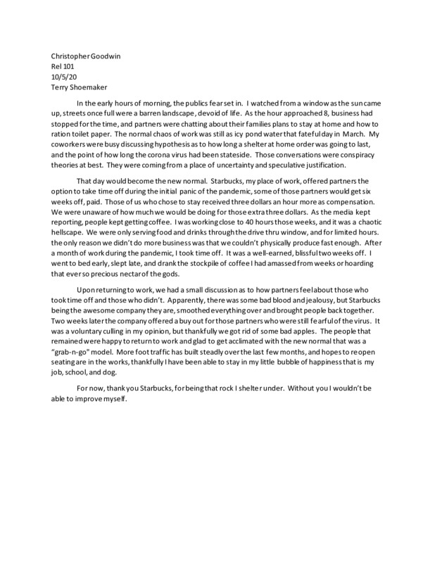In addition, this image will go down in history for future generations to see of the overall impact that COVID-19 had globally. This pandemic made drastic changes to the way of life in which we lived – from curfews to furloughing employees, to food and toilet paper shortages. This image reminds me of my experience with COVID-19. #REL101