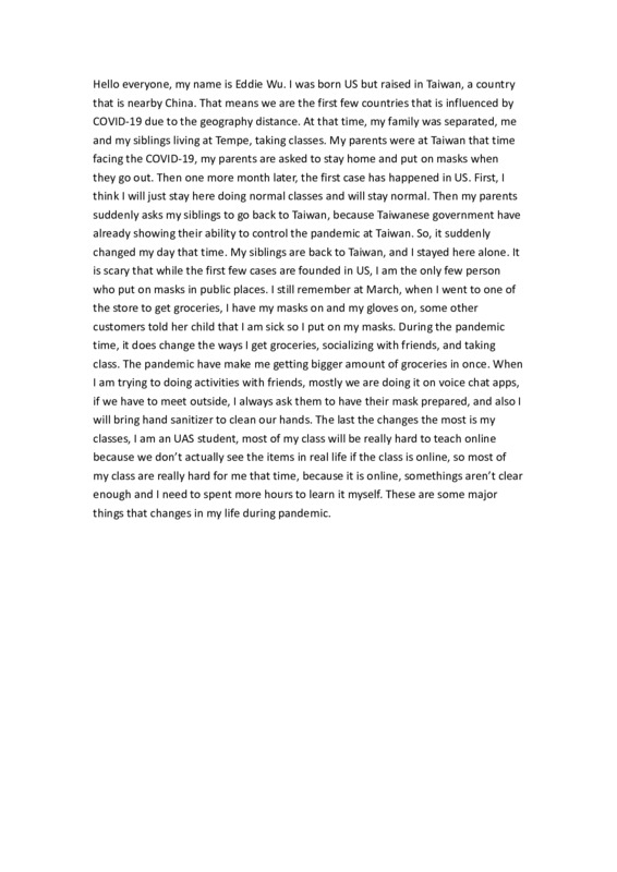 Hello everyone, my name is Eddie Wu. I was born US but raised in Taiwan, a country that is nearby China. That means we are the first few countries that is influenced by COVID-19 due to the geography distance. At that time, my family was separated, me and my siblings living at Tempe, taking classes. My parents were at Taiwan that time facing the COVID-19, my parents are asked to stay home and put on masks when they go out. Then one more month later, the first case has happened in US. First, I think I will just stay here doing normal classes and will stay normal. Then my parents suddenly asks my siblings to go back to Taiwan, because Taiwanese government have already showing their ability to control the pandemic at Taiwan. So, it suddenly changed my day that time. My siblings are back to Taiwan, and I stayed here alone. It is scary that while the first few cases are founded in US, I am the only few person who put on masks in public places. I still remember at March, when I went to one of the store to get groceries, I have my masks on and my gloves on, some other customers told her child that I am sick so I put on my masks. During the pandemic time, it does change the ways I get groceries, socializing with friends, and taking class. The pandemic have make me getting bigger amount of groceries in once. When I am trying to doing activities with friends, mostly we are doing it on voice chat apps, if we have to meet outside, I always ask them to have their mask prepared, and also I will bring hand sanitizer to clean our hands. The last the changes the most is my classes, I am an UAS student, most of my class will be really hard to teach online because we don’t actually see the items in real life if the class is online, so most of my class are really hard for me that time, because it is online, somethings aren’t clear enough and I need to spent more hours to learn it myself. These are some major things that changes in my life during pandemic.