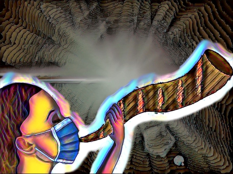Because of Covid-19, we both got a little of our preferred way to worship. Watching the live stream and participating via Zoom allowed my mother to re-connect with temple members whom she had missed. Yes, the meeting was lacking in many ways, but it was better than not attending at all. I was able to stay off-screen, listening to the service while drawing. It was during the service that I drew the image I titled “A Muted Rosh Hashanah”, which depicts a young girl attempting to blow a shofar through a protective mask. With this drawing, I hoped to convey the beauty and passion of the shofar, as well as the pain and longing that the pandemic and social distancing has caused.
