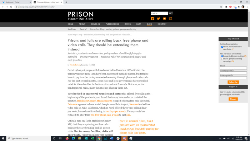 When Covid-19 hit the US many things shutdown including the nation's prisons. Of course they kept taking in people for incarceration but they no longer allowed visitors. This made connection to the outside world through phone calls even more important. What many people don't know is that each phone call an incarcerated person makes costs money, a lot of money. In the beginning of the pandemic many jails and prisons offered free phone calls, in the case they were even allowing phone calls (that's another story) but as the pandemic has continued for nearly eight months phone calls are no longer free or reduced cost. This is an undue burden on a population that is facing high unemployment.