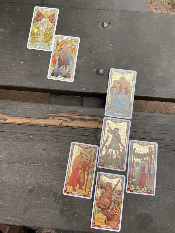 We made our way around the area, trying to find a place to sit and relax. We passed through a tunnel that ran underneath the road. Spray painted on its walls, in red paint, was “Chief Niwot’s Curse” and “Stolen Landz.” My friend and I both took pictures of the graffiti because it “spoke” to us in a way that art or a well-timed coincidence often does. Our country was birthed in blood and forged in violence. This got us thinking about how the United States might quite literally be “cursed,” so long as Americans collectively refuse to acknowledge that fact that we stole the land from Native Americans. My friend and I found a picnic table and immediately pulled out a Tarot deck to do a reading. Whether or not divination is an accurate reflection of reality, does not matter. The subjective interpretation of a story, (and the symbols therein,) is subjectively real. It’s also fun. And sometimes, it’s scarily accurate.