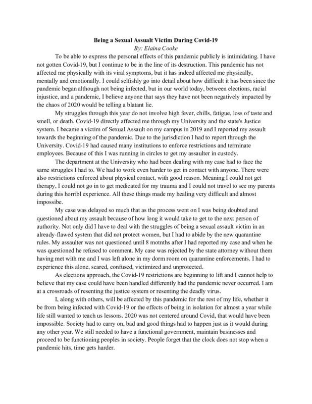 I would like to share my story for future generations that look back on the chaos that took place this year. I also wanted to give a different perspective of the different effects quarantine had on people like me. This is my story about dealing with my Sexual Assault during a pandemic.