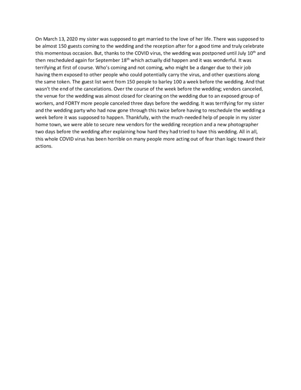 My experience with the pandemic isn't one that drastically changed my life. I work at a gas station and I live in a rural town with the majority of the people being Republican. Which I know you must be thinking what does this have to do with it, well it actually has a lot to do! Majority of the people believe that this is all a hoax and do not believe in wearing a mask. Our customers who come into the store act as if Covid-19 isn't happening. I very rarely have someone who takes Covid-19 seriously, one customer that made me realize that times have change when he literally pulled out a disinfectant spray and then proceeded to spray the pinned before entering his pin. I have to admit even I thought he is exaggerating a bit by spraying the pin pad even when he is clearly wearing gloves. At my job my bosses did not really take Covid-19 seriously since they did not ask us if we wanted to wear mask, gloves, or even put the 6 feet markers on the floor so people would not crowd on top of each other. In fact most people out here in my rural community make comments saying "Are you really wearing mask", "You do know that is not going to protect you from anything" and my favorite one of all is "this is all a hoax, it will all calm down when the elections are over". All in all my town and I were not heavily affected or restricted with Covid-19. Although some places may have the mandatory mask requirements most people either avoided those places or just complained about how unnecessary it is to wear a mask.