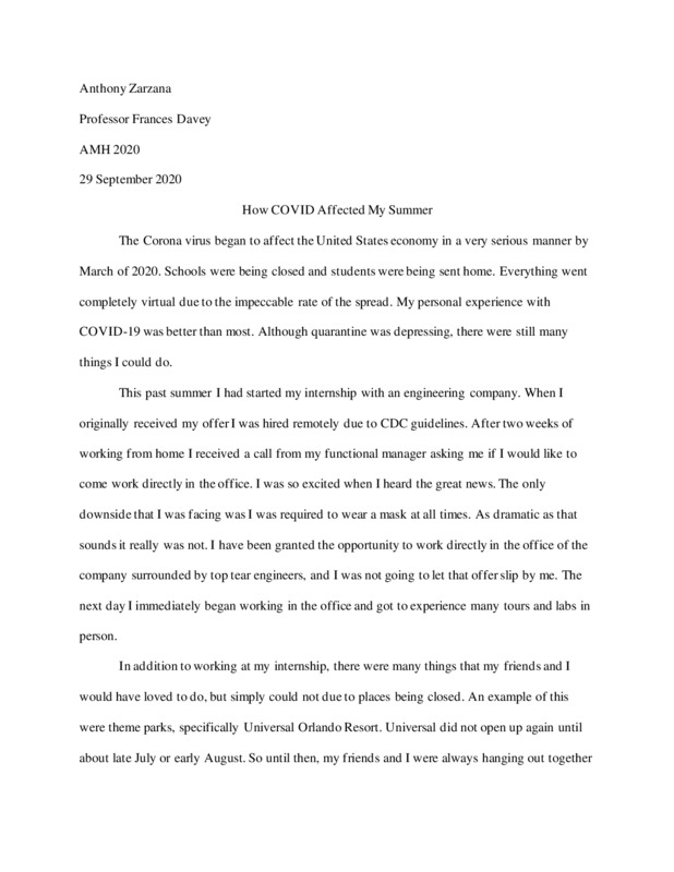 The COVID-19 pandemic was something I definitely did not expect. It was a shock to not only me, but also to everyone in this world. This pandemic completely shifted my life into something entirely different from what I’m used too. Pre-COVID-19, I did not have to think about leaving my house with a mask on. Now, while we are still in the pandemic, leaving the house with a mask on is part of my everyday essentials. Wearing a mask is currently part of my wardrobe. I bought reusable masks because they are not good for the environment. Global warming is a very big issue that many people do not believe in, but I do believe in. I try my best to help the environment as much as I can, so buying reusable masks is what I did. Also, those medical masks are so expensive now, it is something I cannot afford to keep buying. While on the topic of expensive, I was someone who always carried hand sanitizer with me wherever I went. Now that hand sanitizer is a necessity due to the virus, it was hard for me to find them in stores, and when I did find them, the cost was two times higher than it originally would be. Money became an issue for me due to the change of price in many things. I did not work during the start of the pandemic because I was scared to put my families lives at risk. I work now, but I practice social distancing as much as I can, I sanitize, and I wear a face mask at all times. The hardest part about being in quarantine would be remote learning, and it still is. I was someone who despised online classes. I always avoided taking them. However, due to the pandemic, I had no other choice but to take online classes. I appreciate the effort my professors put into trying to make everything work, but it will never be the same as being in class physically and learning. Taking online classes is so stressful because I am basically teaching myself. Depending on the professor, somethings are just not clearly explained so I am left confused very often. Trying to manage everything in my personal life on top of online classes is not easy. Working academically in the comfort of my own home, with my family was and still is a struggle. I need to be in a different environment other than my own home in order for me to fully concentrate and study for my classes. Another constant issue with remote learning is my horrible WIFI connection. My WIFI has been a mess since quarantine started. Having bad WIFI added on to more stress for my online classes because I needed the internet to finish my work and pass my classes. Nonetheless, the CDC is trying their best to stop the spread of COVID-19. This pandemic has caused a major shift to the world, especially mine. The best thing I can do is to continue to work hard and do the best that I can. We have been in a pandemic for 7 months now. Unfortunately, this is our new normal.