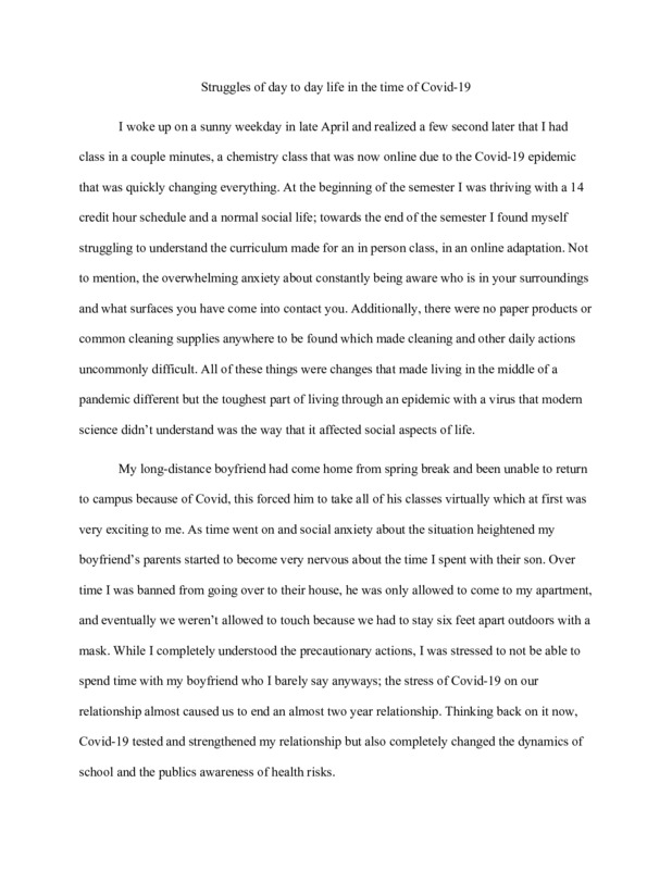 This is a description of the way that covid changed little things in my life but also how it affected by academic life and my relationships. This is important to me because the impact that Covid has had in my life has been shocking and eye opening, which is a story that I thought would be worth sharing.