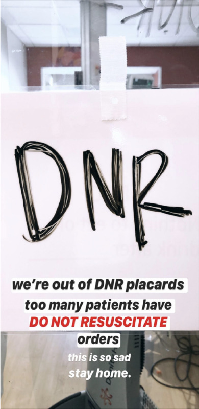 My sisters are nurses on the COVID unit at St. Josephs Hospital and they are starting to see a lot more of these signs popping up. So many in fact that they are having to make their own because so many patients have received 'Do Not Resuscitate' orders. For those who don't know, this is an order caretakers follow when a patient is excluded from basic recovery care when their heart stops or they stop breathing. On the COVID unit, patients and families are facing their own mortality through this decision. This order has become more common during this pandemic because of how easily it is transmitted. Sometimes the order is requested by the patient but recently the decision has fallen on the doctors in charge. Visitors aren't allowed and ventilated patients can't provide input. The news is often broken to the families through a phone call or, if your lucky, a Zoom call. These orders are put in place when someone is nearing the end of their fight with COVID, to prevent the transmission of the virus to the nursing staff. This is a screenshot from my sisters Instagram showing an example of a hand made sign on her unit.