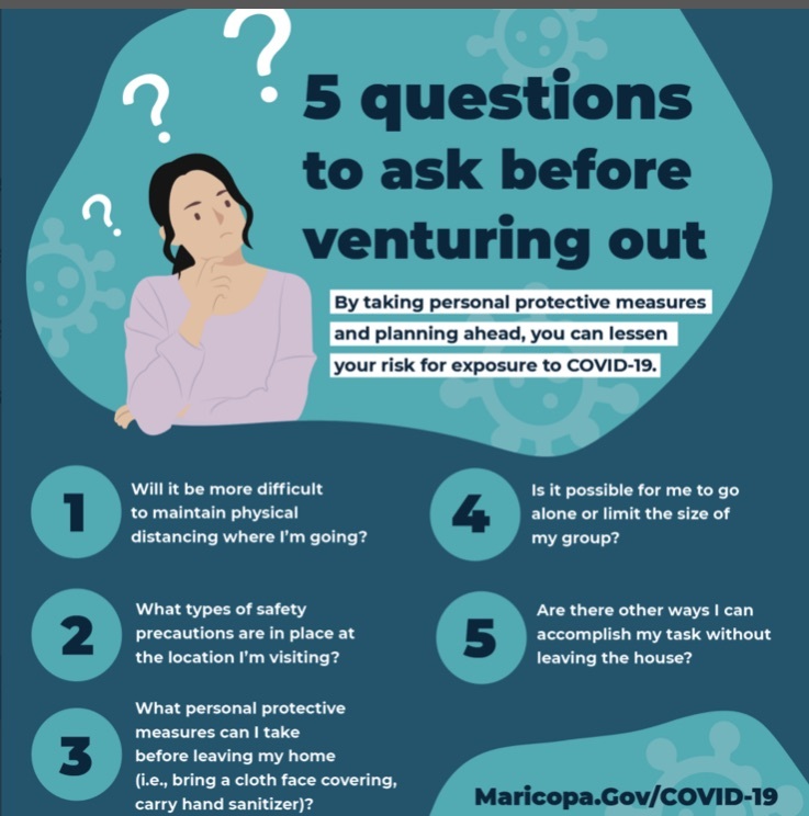 This graphic was posted where I work and on the Maricopa County government website. It gives the reader some points to consider before venturing out in public. This graphic is part of a series of similar graphics to help inform the public on how to safely socially distance during this pandemic.