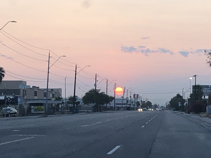 I snapped this photo on the way to work on Sept 14th. The smoke from several wildfires burning had drifted into Arizona turning the sky into a hazy orange. Usually driving to work at that time of morning means the sun is right in my eyes, but this morning, the sun was a weak red dot, indicating just how thick the smoke was, and just how widespread the wildfires are along the west coast.