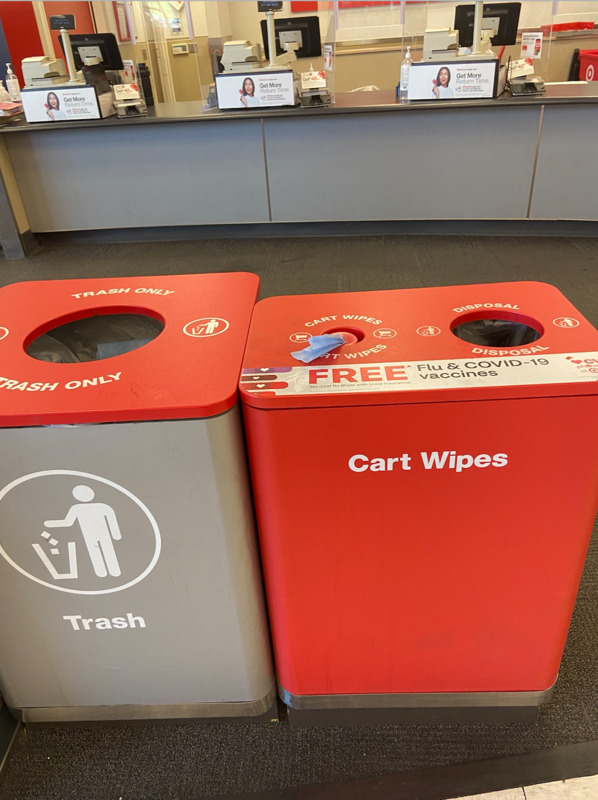 This is where you can get cart wipes at Target while shopping. In addition to the thing itself, it gives you information on where to get a COVID vaccine. Wiping down surfaces has become a bigger thing since COVID, as it would help reduce the spread. COVID itself can't survive on surfaces for very long, but it can be there for a short amount of time. Using things like cart wipes is a way to prevent COVID and other diseases.