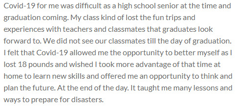 Covid-19 for me was difficult as a high school senior at the time and graduation coming. My class kind of lost the fun trips and experiences with teachers and classmates that graduates look forward to. We did not see our classmates till the day of graduation. I felt that Covid-19 allowed me the opportunity to better myself as I lost 18 pounds and wished I took more advantage of that time at home to learn new skills and offered me an opportunity to think and plan the future. At the end of the day. It taught me many lessons and ways to prepare for disasters.