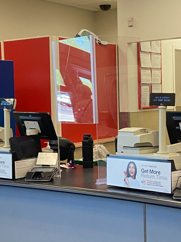 This is a sneeze guard seen at Target. This is a COVID-era restriction meant to prevent the spread of COVID. Even though most restrictions are gone, these are still up.