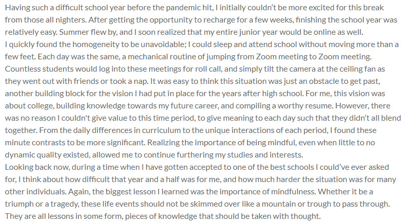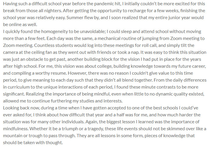 I quickly found the homogeneity to be unavoidable; I could sleep and attend school without moving more than a few feet. Each day was the same, a mechanical routine of jumping from Zoom meeting to Zoom meeting. Countless students would log into these meetings for roll call, and simply tilt the camera at the ceiling fan as they went out with friends or took a nap. It was easy to think this situation was just an obstacle to get past, another building block for the vision I had put in place for the years after high school. For me, this vision was about college, building knowledge towards my future career, and compiling a worthy resume. However, there was no reason I couldn't give value to this time period, to give meaning to each day such that they didn’t all blend together. From the daily differences in curriculum to the unique interactions of each period, I found these minute contrasts to be more significant. Realizing the importance of being mindful, even when little to no dynamic quality existed, allowed me to continue furthering my studies and interests.