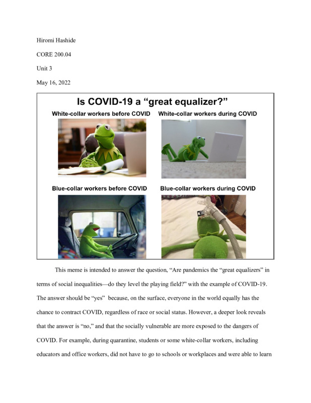 I made two memes. The first meme is intended to answer the question, “Are pandemics the “great equalizers” in terms of social inequalities—do they level the playing field?” with the example of COVID-19. And the meme says the answer is “no,” and that the socially vulnerable are more exposed to the dangers of COVID. The second meme is intended to answer the question, “Have you observed any patterns of human behavior with the Covid-19 pandemic?” Former President Trump called COVID the “China Virus” and fueled people’s hatred of Asians. This meme tries to remind the audience of his negative remarks but in a humorous way without offending Asian populations. It also illustrates how words can magnify feelings of racism, fear, and uncertainty, which can result in scapegoating. This meme gives the audience an opportunity to learn more about the unfair treatment of Asians during the pandemic and why it happened.