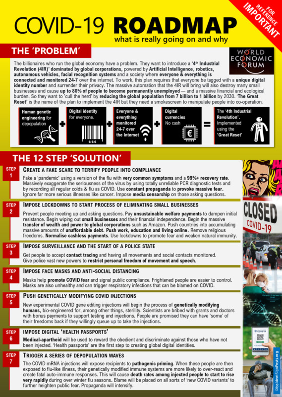 This double-sided A4 leaflet provides an extended summary overview of the supposedly 12-step plan behind the COVID. This leaflet was taken from the dissidentsignposts.org, and they hope to inform people about the “real” reason behind the COVID pandemic. This leaflet says that the billionaires want to impose new ways for global corporations but for their plan to work, they need to acquire everyone to be tagged with a unique digital identity number and surrender their privacy. As this leaflet points out, the “New Normal” that billionaires want to accomplish is to be depopulated, cleaned-up, high-tech, dehumanized, totalitarian dictatorship, genetically modified, digitally tagged, nano-chipped, etc. this leaflet tries to persuade the audience by pointing out that the COVID pandemic is just a big scheme in hopes of taking control of the total population. The 12 step that is mentioned explains the different reasons why the government is pushing for people to take COVID and the vaccines seriously. I have heard of this idea before from my friends. They were talking about it, but to me, I believe that COVID is real. I have seen my family members getting infected by the virus. I will never believe things like this and I will never let anybody put a chip or something within me. Although our world is getting more and more highly advanced, I believe that this so-called “Great Reset” will not take place.