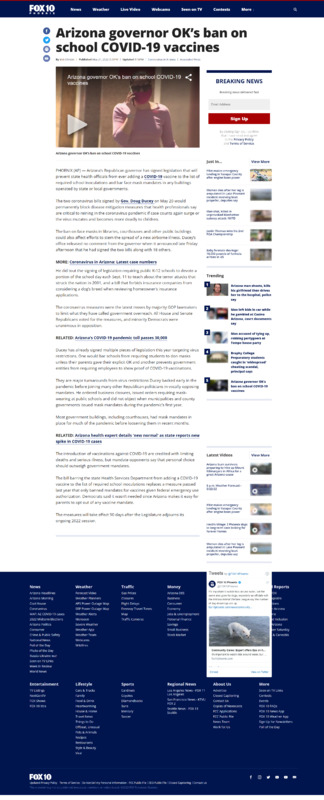 This is a news story from Fox 10 News by Bob Christie. Governor Doug Ducey has recently signed legislation that would prevent state health officials from adding COVID-19 vaccines to list of required school vaccines. This legislation was done by the GOP to prevent government overreach.