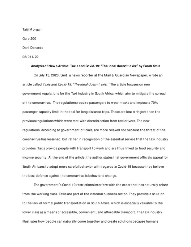 I am from South Africa. I wrote this analysis of a news article about Covid-19 regulations on the taxi industry in South Africa because during the pandemic I have heard many middle class people complain that working class people are irresponsible for traveling in crowded taxi's to work. My analysis pushes against this narrative, and illustrates how restricting the taxi industry is unjust, oppressive and unhelpful. Moreover, I suggest some alternative ways government can be helping.