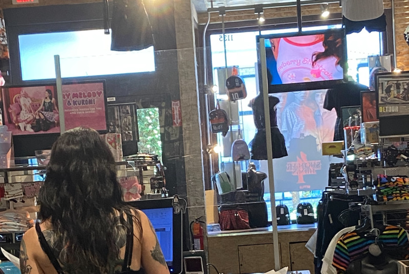 This is a sneeze guard at Hot Topic. The staff themselves were not wearing masks, but the sneeze guards were still up. Since both cash registers were being used, I took a picture from the back for privacy reasons.