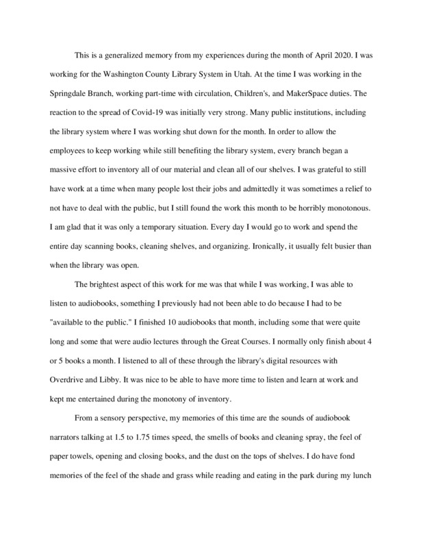 This story shows how pandemic radically changed workplace experience, including sensory memories, for my occupation as a library worker in Washington County Utah in April 2020.