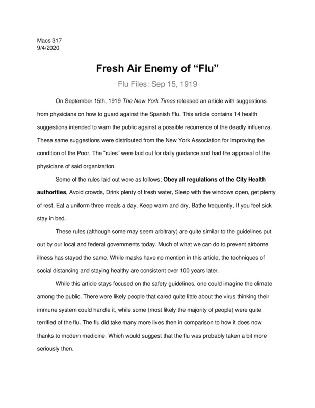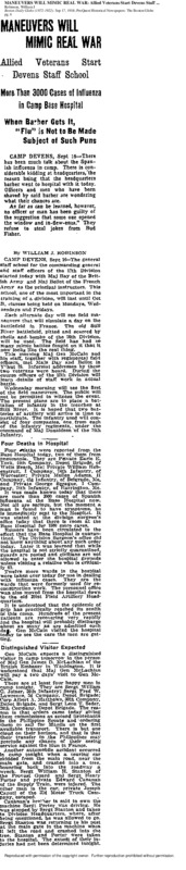 My flu files project is about this article from the Boston Globe, published on September 17th, 1918, nearly 102 years ago and just as the Spanish Flu was starting to become a serious issue in the United States. While the disease was yet to wreak the havoc that would eventually ensue, the seriousness of the flu was already well known, especially around military installations where it originated and often spread.