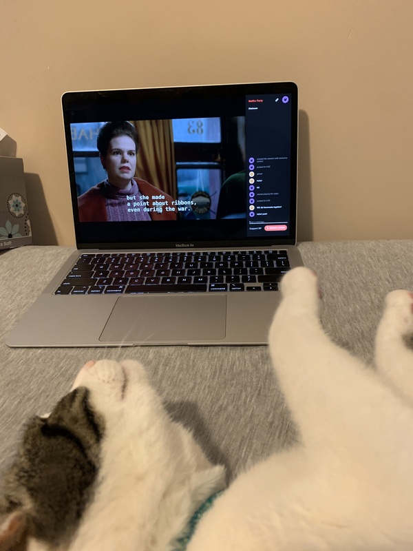 In the months before social distancing due to COVID-19 started in California, my friend and I had been watching our way together through the series Call the Midwife on Netflix. She'd usually come over to my apartment once or twice a week and we'd watch a couple of episodes together. Once COVID-19 became an issue, this was no longer an option, but we still wanted to continue watching Call the Midwife together. Fortunately, we discovered that we could use Netflix Party to watch the show simultaneously on our laptops in our separate homes. Netflix Party also provided a chat box so that we could easily maintain a conversation about the show as we watched. So now, when we want to watch Call the Midwife, I get on my Netflix account, create a link through Netflix Party, text my friend the link, and there we go! As much as I miss being able to watch with my friend in the room with me, it's nice to be able to watch from wherever I want. Like from my bed with my cat rolling around!