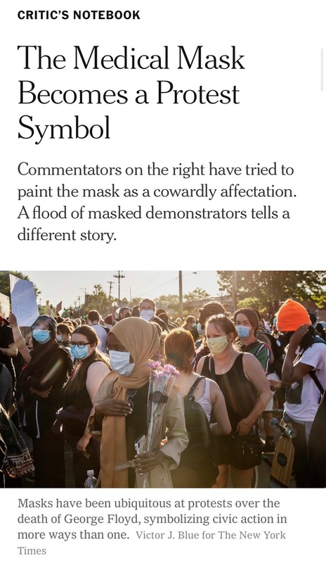 This article discusses the mixed ideas surrounding the wearing of masks. Some people see it as a show of “scientific authority” and respect for the safety of others, but another portion of the public thinks it is a sign of weakness, submission, and cowardice. Masks in America are an extremely political point of conflict. And although the majority of people protesting against the killing of George Floyd wore masks to protect their community from transmission of the virus, the rest of the nation is still in turmoil over the issue. I have experienced my own difficulty with this as well; we have had to avoid unmasked neighbors several times, and when relatives come, we have to be the enforcers of distancing when they visit and remain outside. Mask wearing should not be politicized; it should just be something everyone wears with the safety and health of themselves and others in mind.